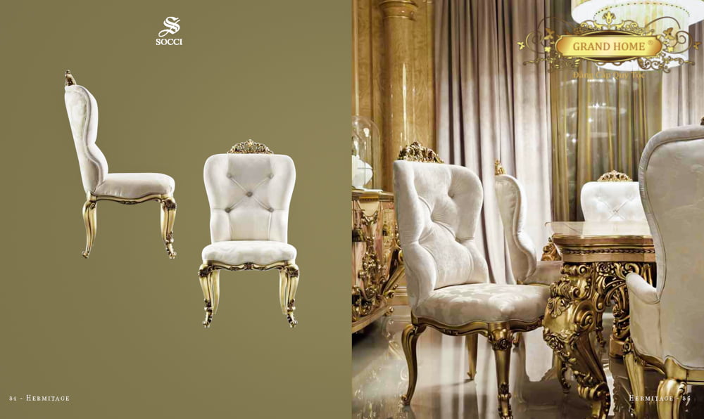 • Bộ Hermitage của Socci kết hợp màu sắc ấm áp và mãnh liệt của gỗ hồng sắc, ô liu, cây phong và bạch dương để tạo nên một bức phù điêu khảm hoa tinh tế. Các chạm khắc trang trí uy nghi của chân, khung và đường gờ bằng cymatium được phủ bằng vàng lá để tăng cường các phù điêu của rãnh tạo hiệu ứng cổ kính